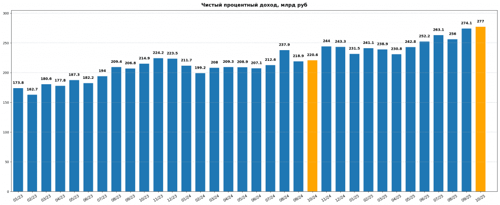 Спрос на кредиты высокий. Бизнес занимает даже по текущим безумным ставкам. А ВВП не растёт. Т.е. бизнес занимает не ради роста, а чтобы перекредитоваться и как-то жить. При этом проценты по депозитам падают. В общем, все деньги мира уходят банкам. И Сбер это собирает в промышленных масштабах.
