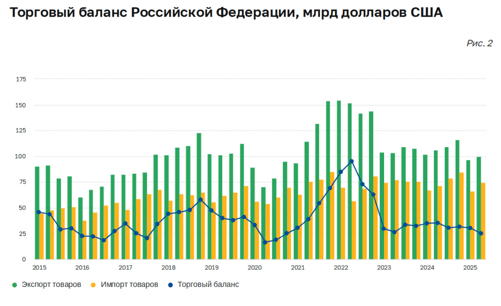 Посмотрите, как усыхает торговый баланс: с +95 млрд в 2 кв 2022 до +25 млрд во 2 кв 2025: