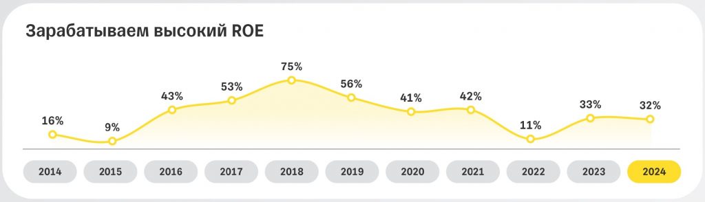 Рентабельность капитала (ROE) уже не та, что раньше. Когда-то она доходила до 75%, а в 2025 году хорошо бы удержаться на 30%. При этом по мультипликаторам это самый дорогой банк на рынке.