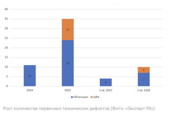 🔹 1 квартал 2026: уже 11 первичных техдефолтов (4 переросли в полноценные)
